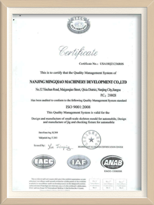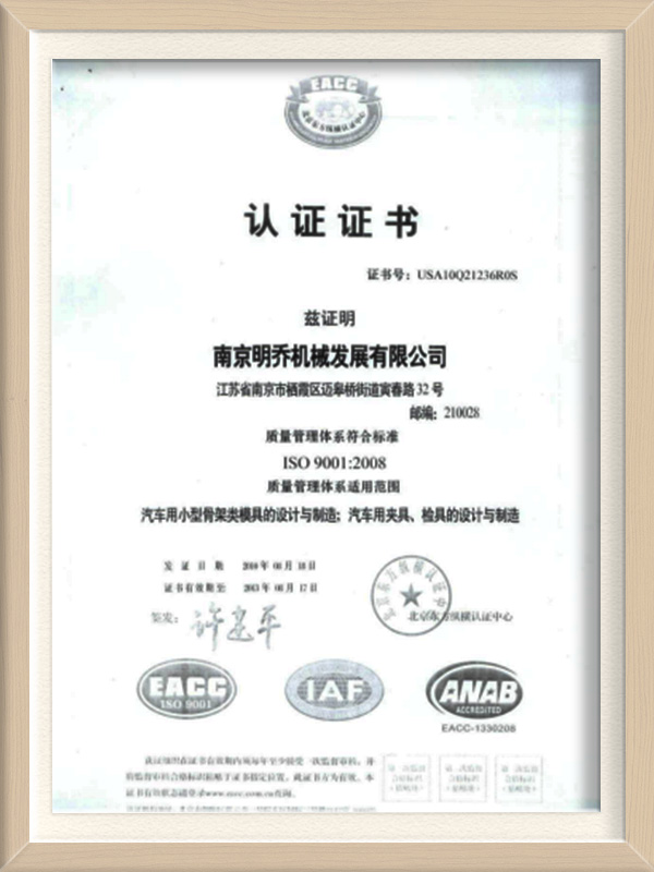 南京明乔机械发展有限公司成立于2004年1月2日,公司位于南京市江北新区六合经济开发区。公司专注于汽车检具及标准件的开发。公司先后进入上汽通用,上汽乘用车,上汽商用车,沃尔沃汽车,吉利汽车,上汽通用五菱汽车,上海蓥石汽车,神龙汽车等多家主机厂的一级配套检具供应商体系。与延锋、德尔福、库博标准、大陆、采埃孚、舍弗勒、佛吉亚、哈金森、蒂森克虏伯、玛汀瑞亚、敏实等众多汽车配套百强企业深度合作...